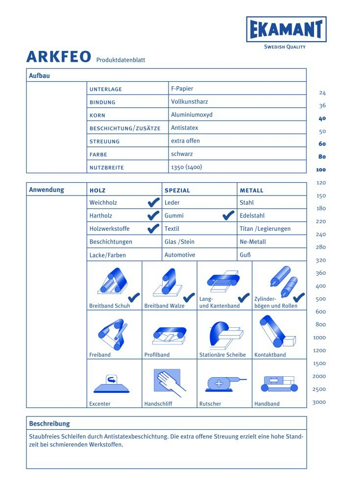 ARKFEO = Staubfreies Schleifen durch Antistatexbeschichtung. Die extra offene Streuung erzielt eine hohe Standzeit bei schmierenden Werkstoffen.